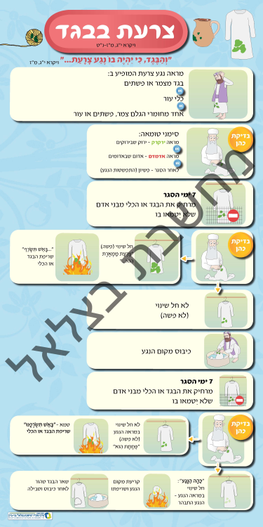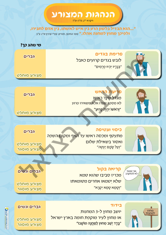 בין הנושאים: צרעת באדם, בבית ובבגד, הנהגות המצורע וטהרת המצורע.